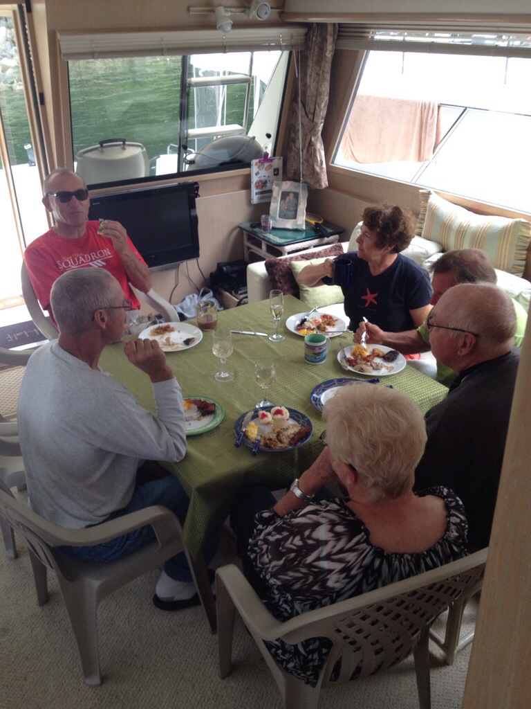 After Garry took his nap, he decided it was time to go knee boarding. Garry is a very young and vigorous 76 years of age and went around the bay doing very well. Then, our commodore, Brian, decided he needed to take a turn. He also did well. Darrel thought about it but was worried about the cold and how it would affect him.