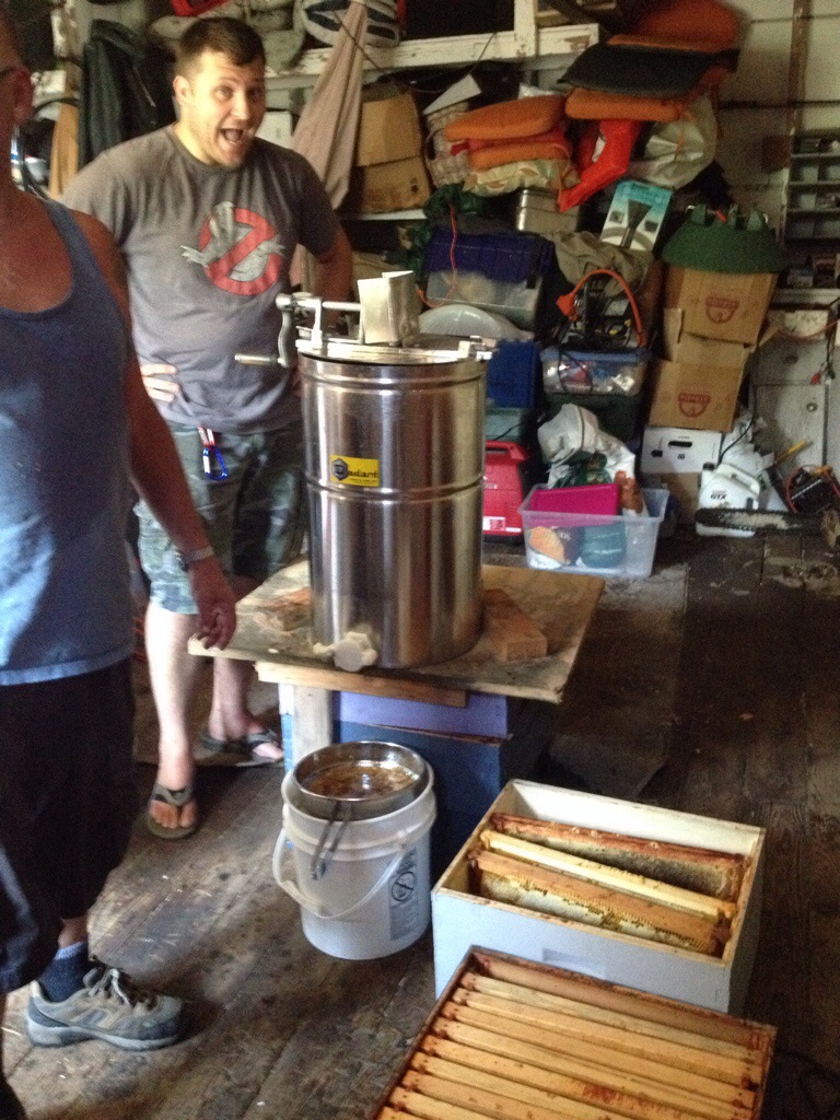 They only did 2 hives, out of 10, and got about 8 gallons so far. They were all sweating like pigs in the closed up garage, but it needs to be closed or the bees come in and try to get their honey back.