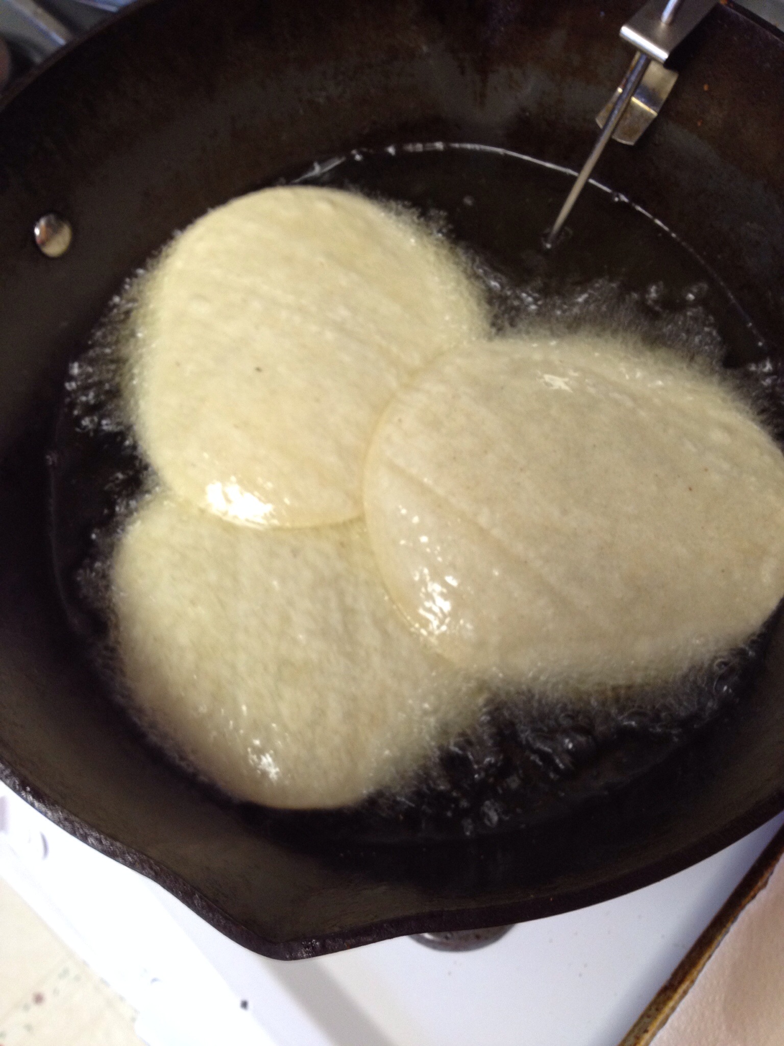 Frying corn tortillas. Note the fry thermometer. It is the best way to be sure the oil is hot enough before dropping in the tortillas.
