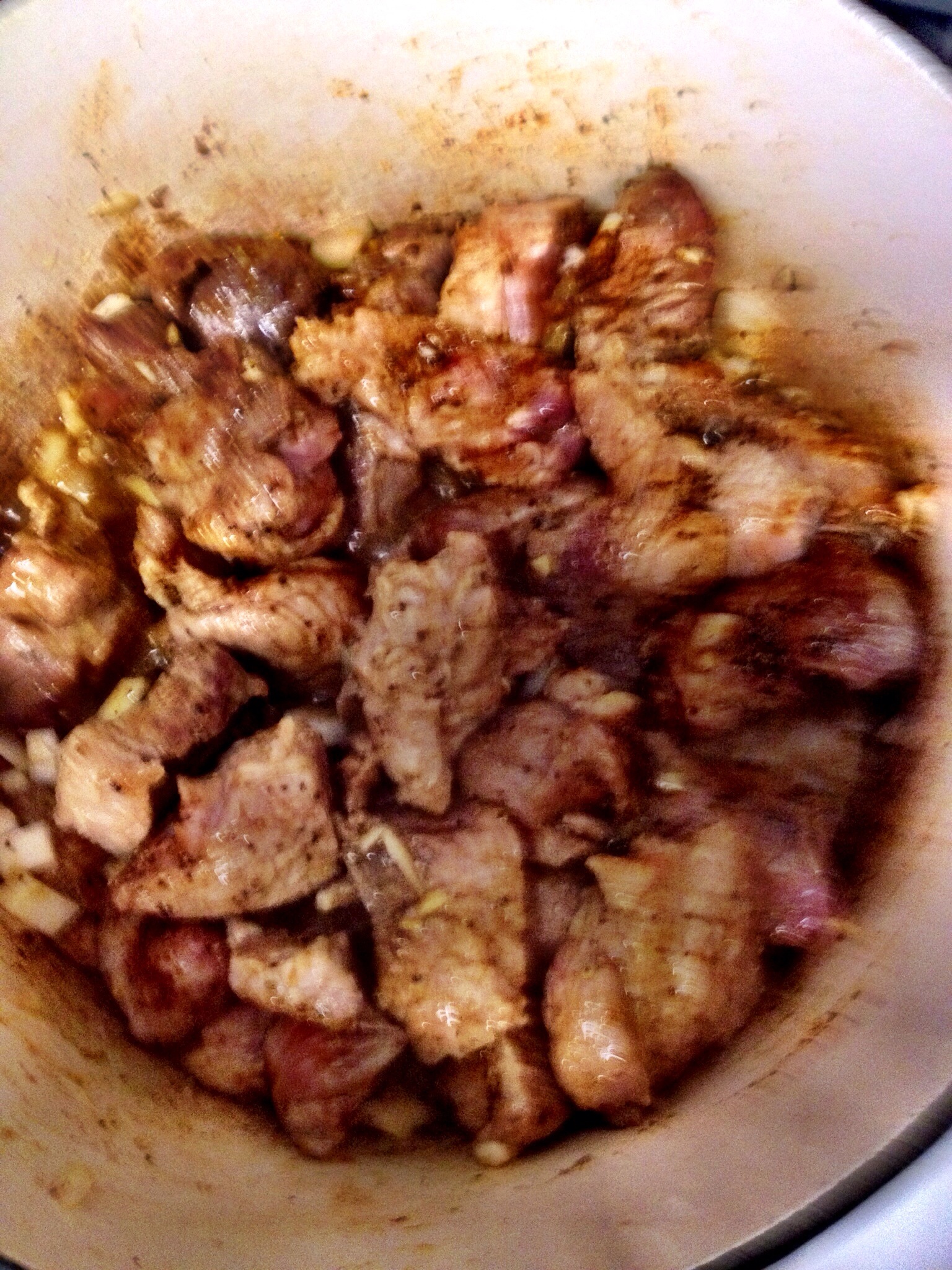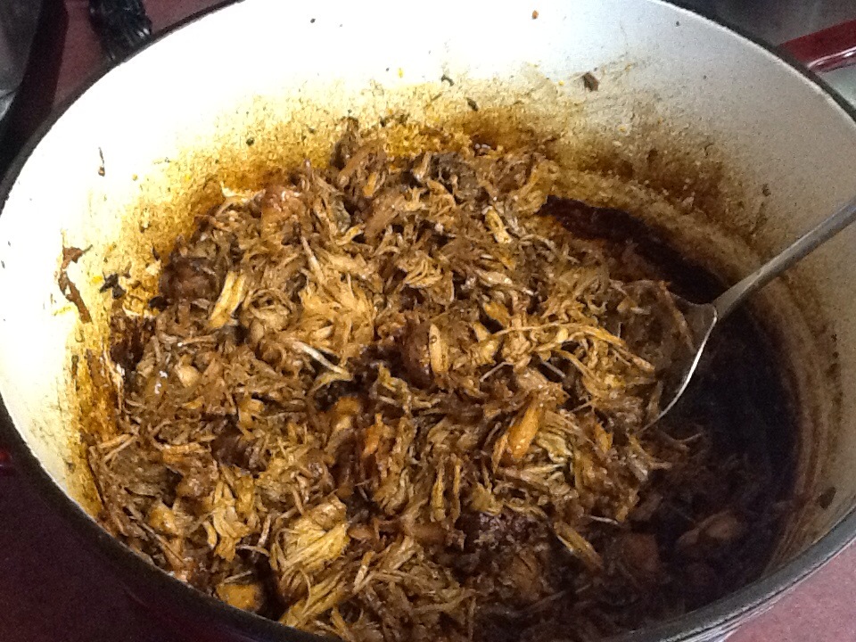 I quick thawed the pork in some water, then cut it into chunks. I browned it a bit in a dutch oven, then added onion, garlic, and spices. Put the lid on and stuck it in the oven on low temperature for a couple of hours.