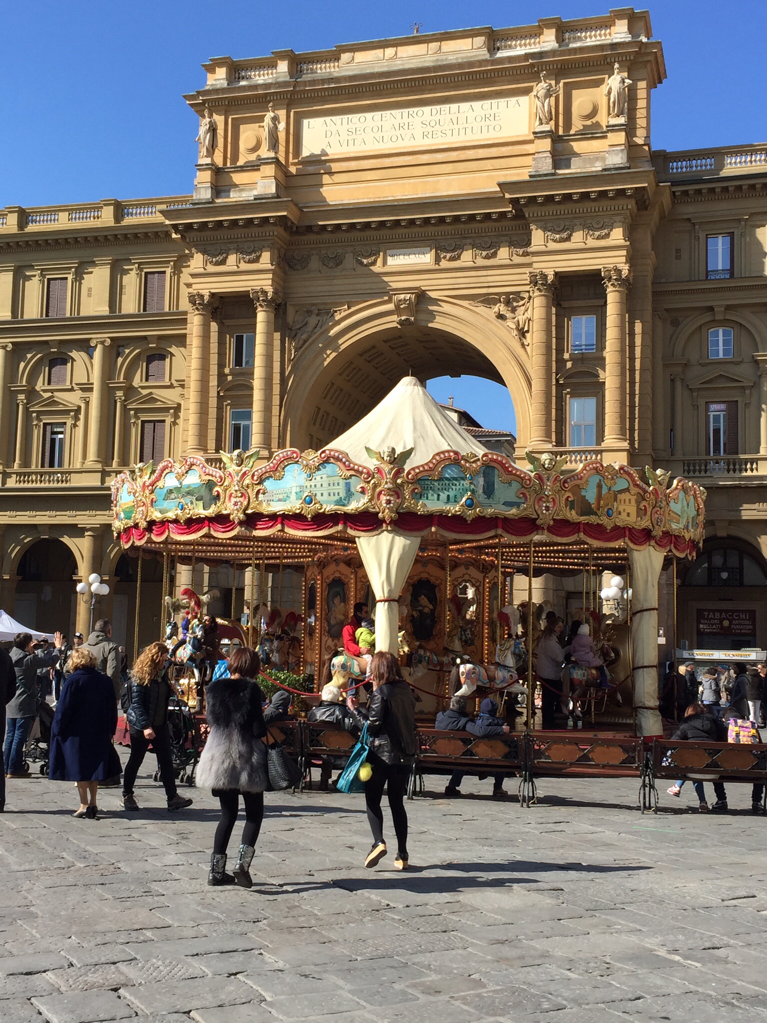 I went back to the Piazza della Repubblica where there is a Roman-style triumphal arch that celebrates Florence’s temporary stint as Italy’s capital, 1865-1871.) I had found free wifi there and once again I tried getting the download for the Renaissance tour.