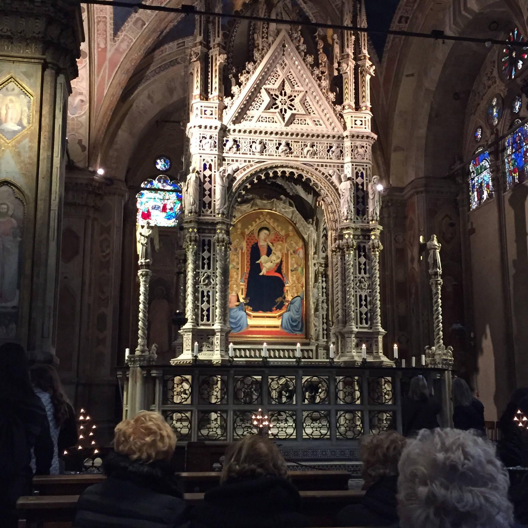 It then headed down via dei Calzaiuoli, a pedestrian street, to Orsanmichele, a gothic church with statues all the way around it of patron saints of the city’s trade guilds, like Masons and Carpenters. It had been a grain market at one time before being turned into a church shortly after it was built! There is a nave that was built to fit inside that is quite impressive.