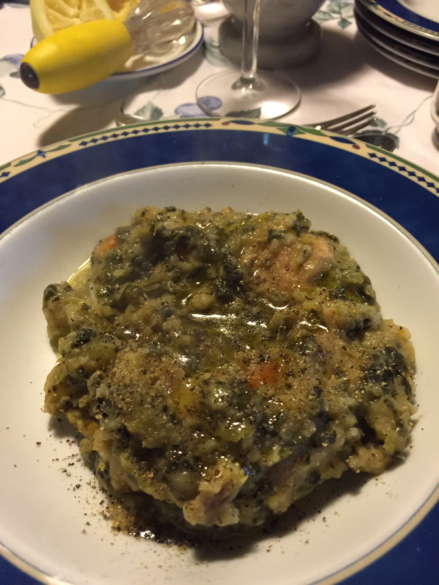 The agreti was the strangest looking vegetable. When I first saw it I almost thought it looked like some sort of water plant. When she looked up the English for it, garden cress, I realized it probably was grown in a wet environment. Francesca cleaned the roots from it then I washed it multiple times. It was simply boiled then dressed with lemon juice and olive oil. Not a lot of flavor either raw or cooked but interesting just the same.