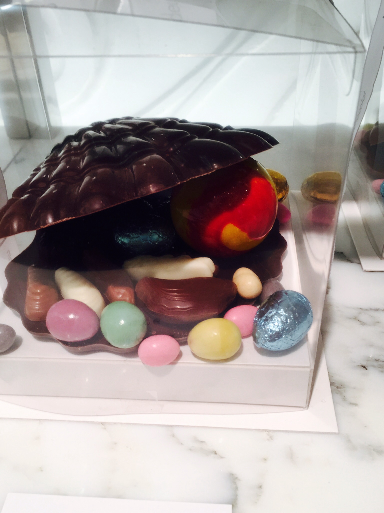 We started at Jacques Genin chocolate shop at 133 rue de Turenne. The shop was on a corner in a very nondescript building with no name above the door or anywhere. But, when you walked in you were surrounded by beautiful chocolate Easter “sculptures” and displays. We had samples of three different chocolates, a creamy caramel, and pâtes de fruits.