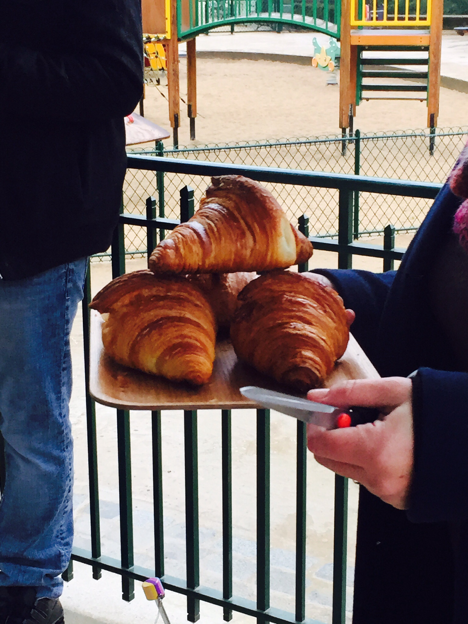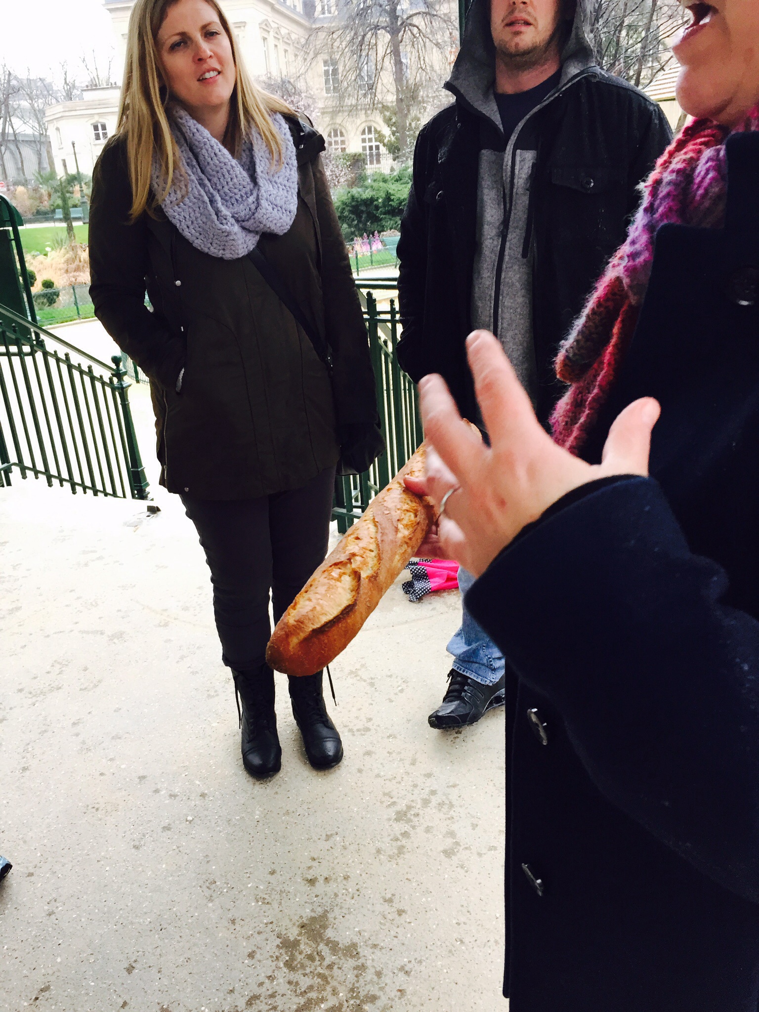 Jennifer purchased a baguette, some croissants, and something called a chouquette. We walked to a beautiful nearby park that had a covered pavillion so we could be out of the rain while tasting. The baguette was crisp on the outside, chewy and delicious throughout.
