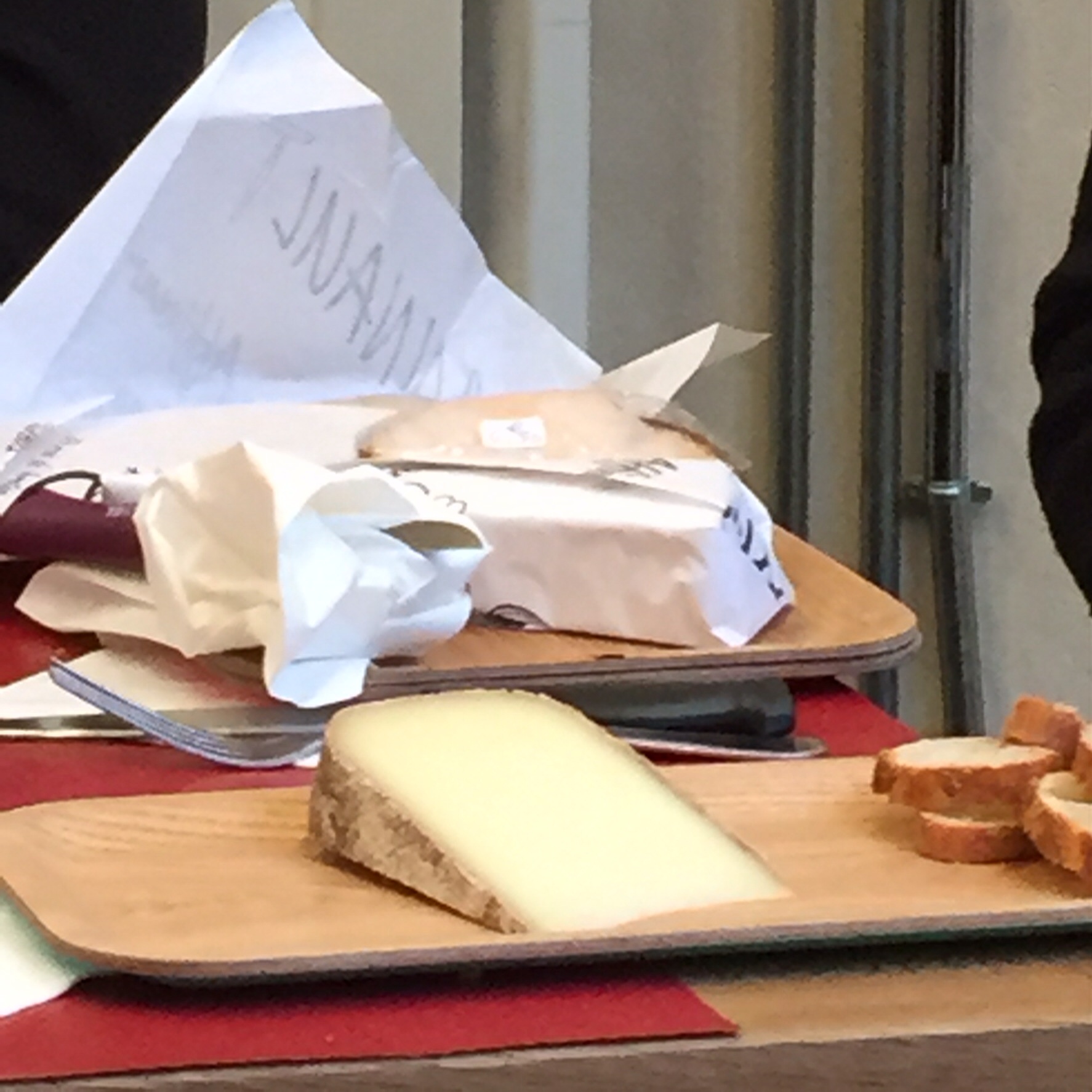 Comté AOC (cow, Jura, 30 months) – has a firm and supple texture that melts in the mouth and leaves a sweet taste (95% of cows used for this cheese are Monbéliarde, known for their sweet milk; the rest are Simmental). Can taste of melted butter, milk chocolate, hazelnuts, toast, leather, pepper, butterscotch, sweet orange. Strong salt but balanced with a nutty tang. This cheese has the highest production figures of all French cheese. Graded on a scale of 1-20. Those that score 15-20 wear a green band, those from 12-15 wear a red band. Below three can’t be labeled Comte. Aged for a minimum of 3 months but can be aged up to five years, although 18, 24, 30 and 36 are more common. (I must have forgotten to take any more pictures so don’t have this cheese or the meats.)