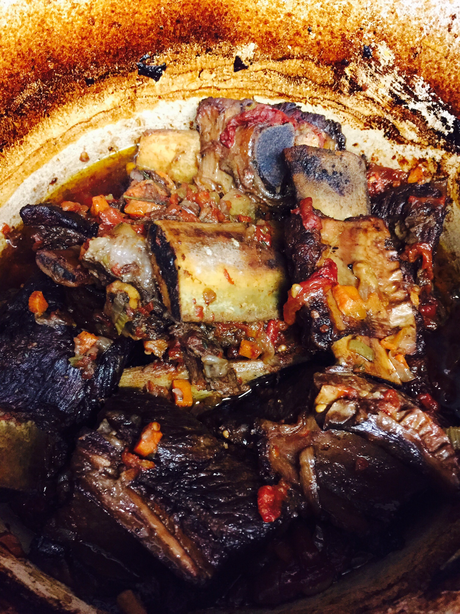 I browned the meat well on all sides. Added chopped onion, carrot, celery, and garlic. After sautéing the vegetables for a while, I added a cup of red wine. I cooked that down then added the ribs back in along with a pint and a half of home-canned tomatoes and more wine. Put the lid on and put it in the 350 degree oven for about 3 hours.