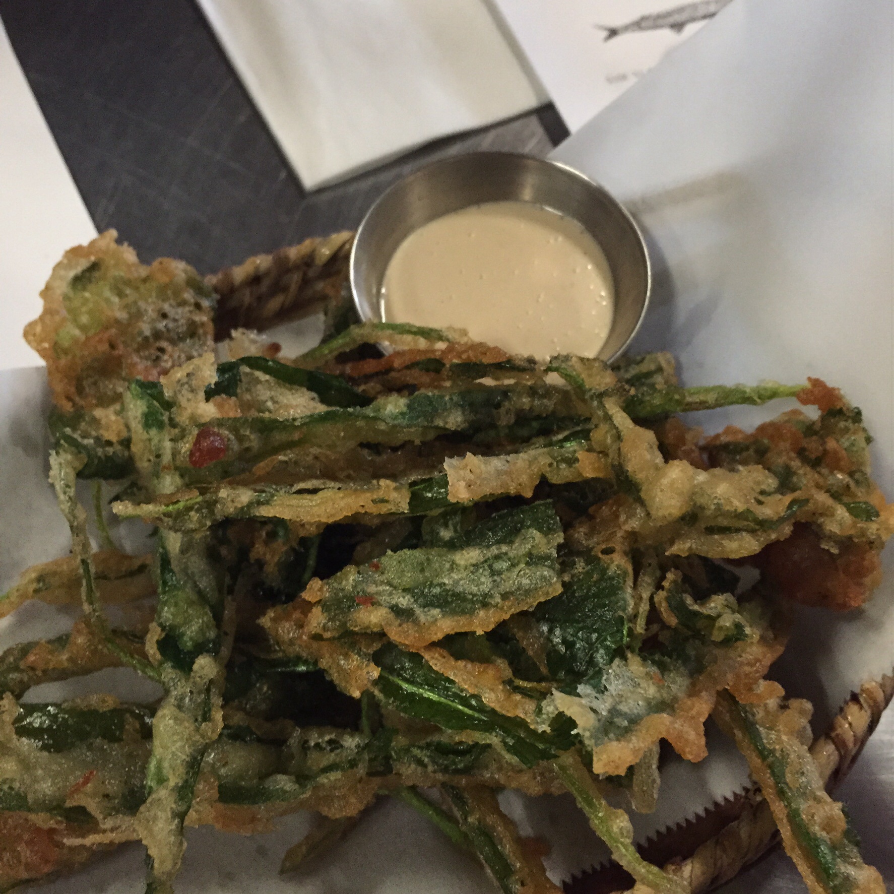The menu was: Crispy Kangkong, beer-battered fried water spinach with calamansi bagoong-mayo; Bagoongumbo, crab, longanisa, okra, bell peppers, celery, onion, shrimp & vegetable stock, mochiko roux, chives;
