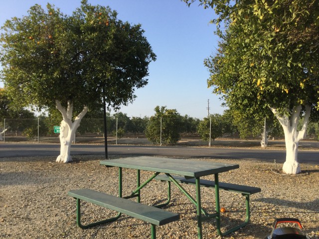 I decided we both needed a break on Thursday so didn’t plan on going far. I found a park east of Bakersfield, Orange Grove RV Park. It literally has orange trees all over and a grove next door. And it is okay to pick the oranges. The trees have oranges on them but they are too high. They do have ‘pickers’ by the office so I might have to get one and try to get a few oranges.