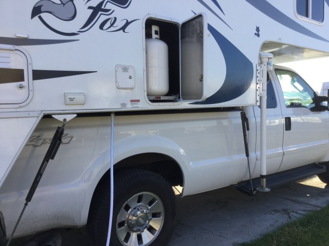 Before going to get propane, I had used my new step stool to try to unhook the tanks. Of course, everything was too tight for me and the wrench I had was too small. So, I just hoped the person helping me would be able to deal with it. It was a huge pain the the ass! Even the guy said so. The propane tanks are too high on the camper, he also had to use the step stool. In the picture below, the bottom of the tank is about 4 1/2 feet high.