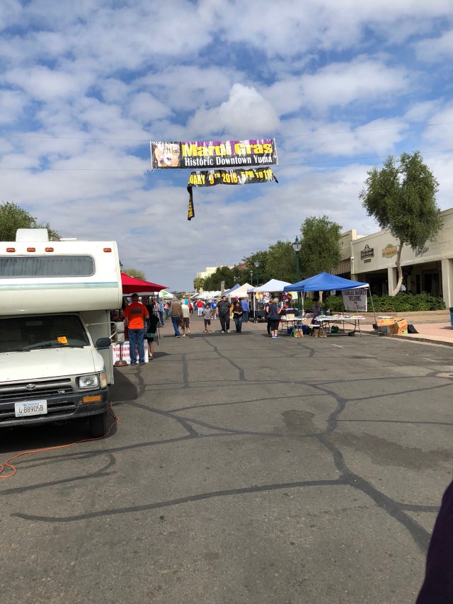 The girls took off and went to downtown Yuma. The ‘farmers’ market was like most these days, mostly booths with non-farmer things. It was fun to see all the stuff and I did buy some small yellow potatoes at the only produce market there. Then we walked along and looked into the stores of the old town Main Street.