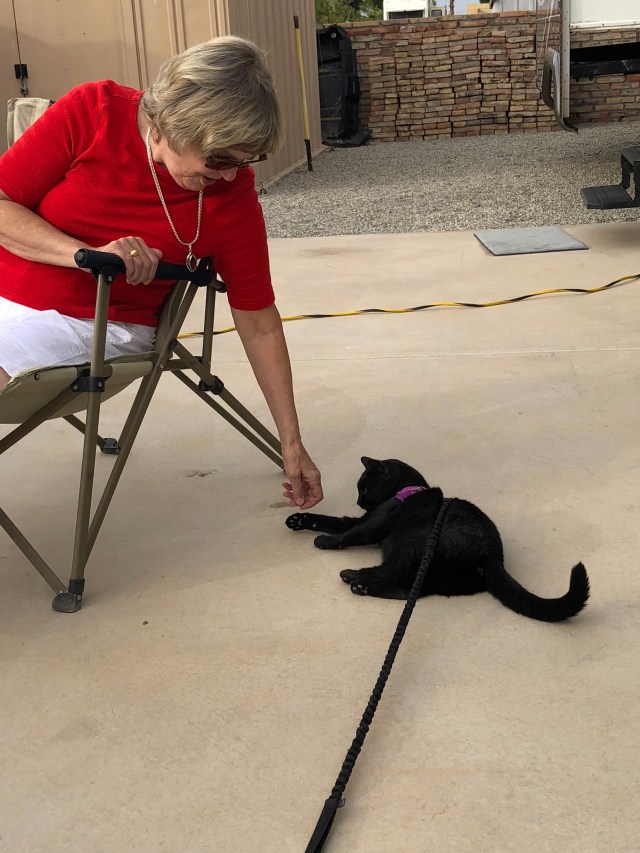 Misty finally decided she would go outside. She spent a good 2 hours outside after all the activity around the electrical repairs was done. She rolled in the gravel and dirt, did a lot of sniffing, allowed herself to be petted by Judy, and generally enjoyed herself. Then she went back into the camper and crashed for the night.