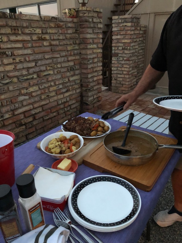I had purchased a big chuck roast on sale the day before and had the little yellow potatoes from the farmers market so had said I would make pot roast. Not something I normally would have made in the desert but the weather has been fairly cool in the evenings (in fact, it had rained quite a bit overnight) and everyone always likes pot roast.