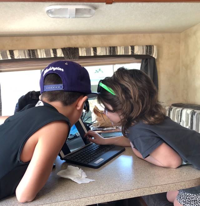 Waylon and Sydney looking at photos. You can just see Misty over Waylon’s shoulder keeping her distance.