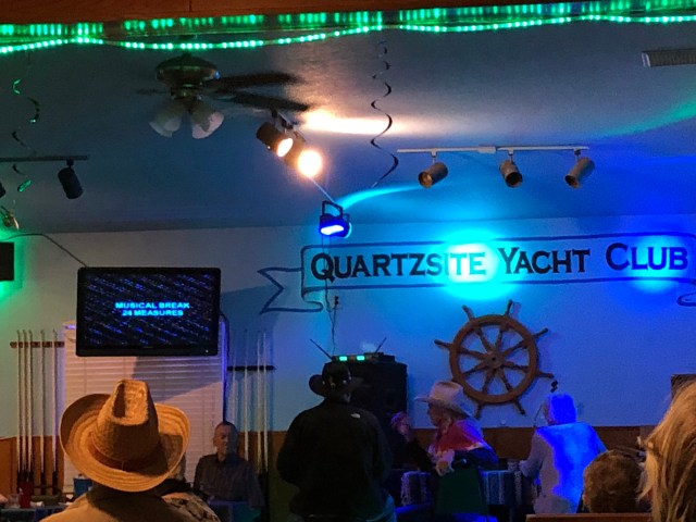 They wanted to go to the Quartzsite Yacht Club for dinner. Kind of funny there being a yacht club in the middle of the desert. I guess a man, Al Madden, with an investment company in California spent a lot of time here and saw a bar for sale so bought it. Being a man of “humor, wit and an active imagination,” he thought it would be fun to change the name to The Yacht Club with the motto, “Welcome aboard – Long time no sea!”
