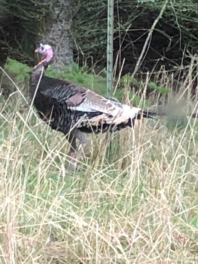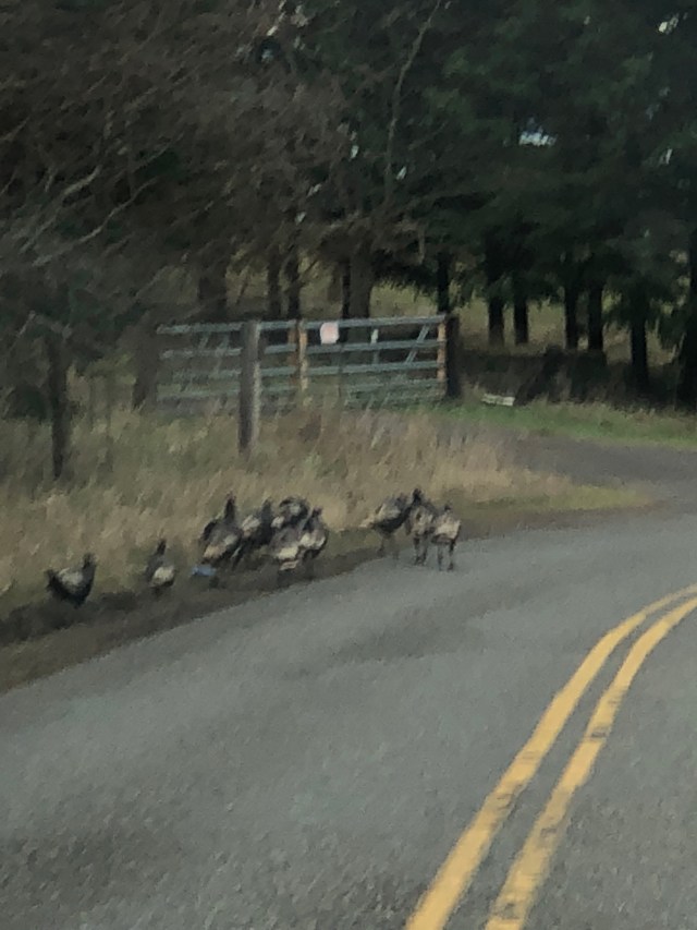 We took off down the road earlier than my norm. Before getting to the bottom of the hill and Highway 14 I came across a flock of wild turkeys on the road. I slowed down and took a couple of pictures. I have never seen wild turkeys before. They even gobble gobbled.