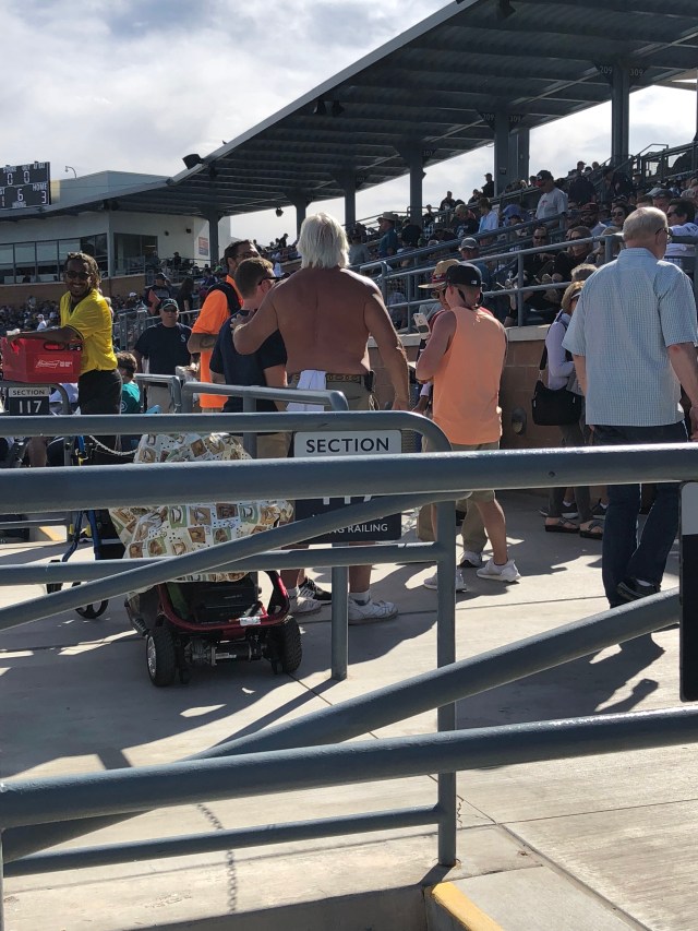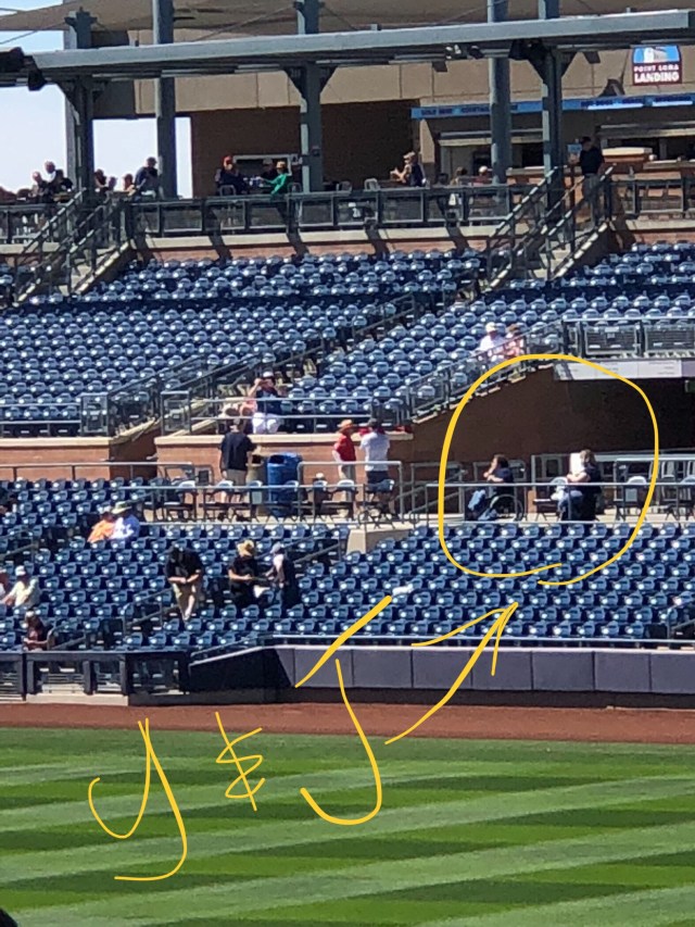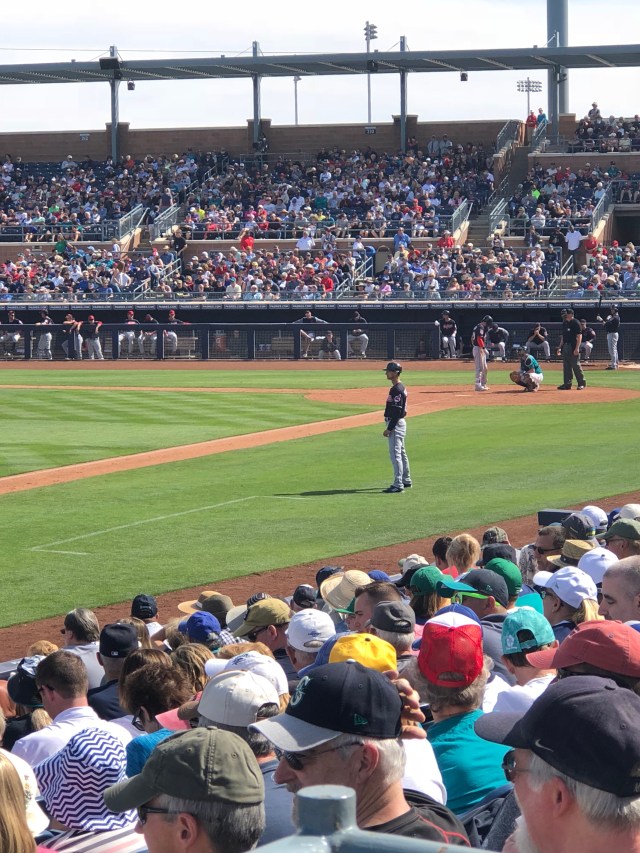 Last Spring Training game of the 2018 season for us. After breakfast while we were getting ready, I pulled out the tickets and looked at them and realized they were not in a wheelchair accessible area. They were in section 102 which used to have a chair section but we had noticed yesterday it was no longer there. Plus, the row was not a WC row. Uh, oh. I suggested we leave early so we could get to the ticket booth and see about getting them exchanged.