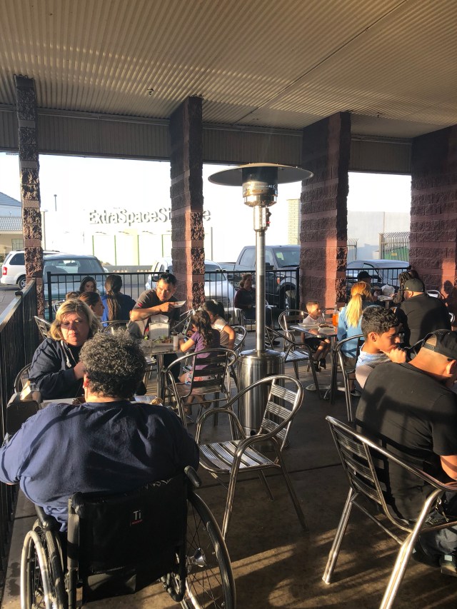 We thought maybe since it was fairly early on a Sunday it might not be as crowded as usual. Ha! It was probably as crowded, if not more so than usual. We did find a table outside and I ordered for all of us while Yvonne got lots of little containers of salsa and Jennifer laid claim to the table. Notice it is all Mexican nationals except for us. That is the usual way it is. They have a pretty good system and get the food out quickly, however.