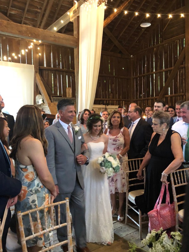 Bill, Patti, and Christine had been told to be there at 3:30 – 4:00 for family photos but I guess that didn’t happen until after the wedding. Then Christine was taken downstairs so she could be walked in with her dad, which was news to her. Seemed like a little miscommunication around some of the details.