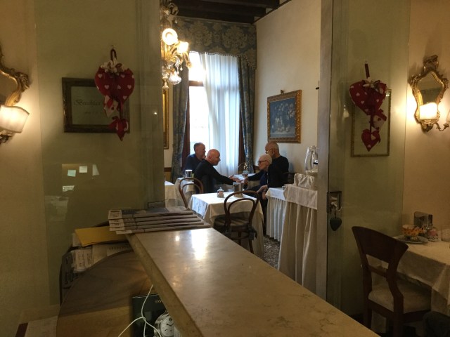 We are staying at the Palazzo Odoni which is a XV century building with a warren of rooms. Ann, Patrice, and I are in one suite. My room is through theirs with my own bathroom and shower, which is nice. The room is very nice and fairly large for Europe. It doesn’t have much of a view, but it does have two large windows.