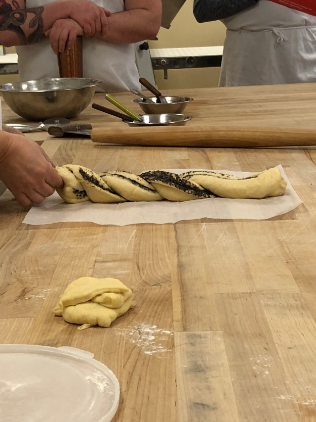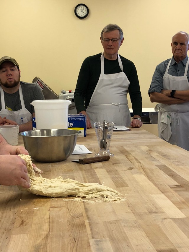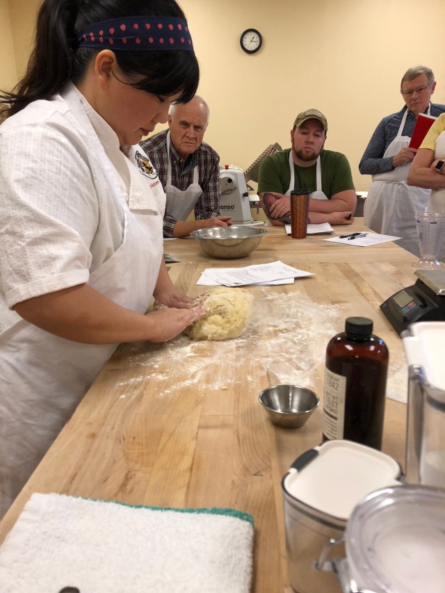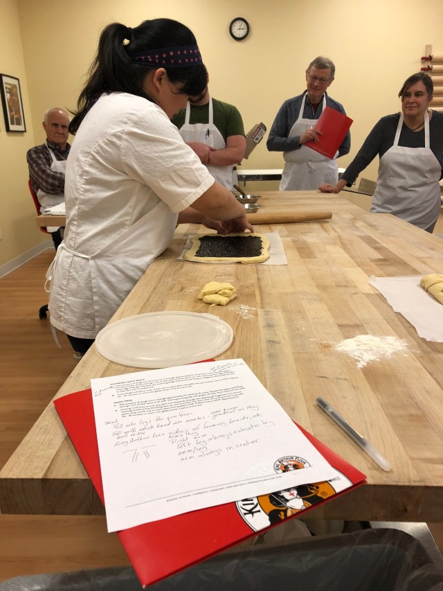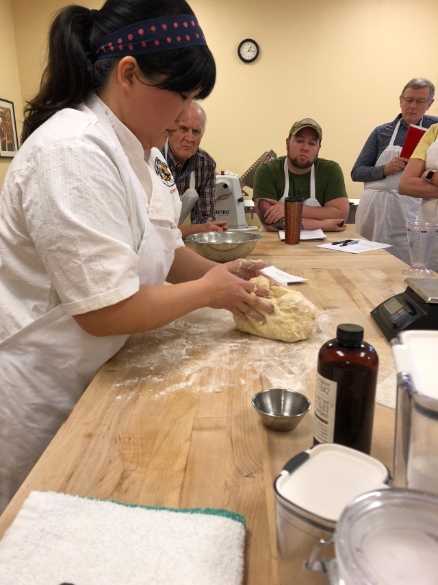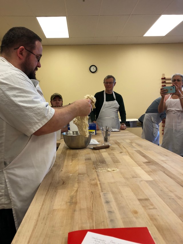 It is a goopy mess to start and your fingers are covered with dough but the more you do it the more it starts to come together and eventually it quits sticking to the work surface and your fingers. It got really noisy in the room and people’s bowls and other items were being bounced off the work tables and onto the floor, which only added to the noise. It is rather tiring and everyone worked up a bit of a sweat.