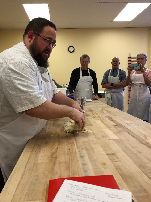 He then showed us how to knead it. The dough is a very wet (hydrated) dough and has to be handled in a different way than the ones we had done before because you want the dough to stay wet and you don’t use flour in the kneading.